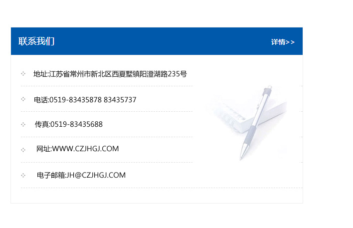 傳真:0519-83435688    郵編:213135    網(wǎng)址:WWW.czjhgj_com.zjltyx.com    電子郵箱:JH@czjhgj_com.zjltyx.com